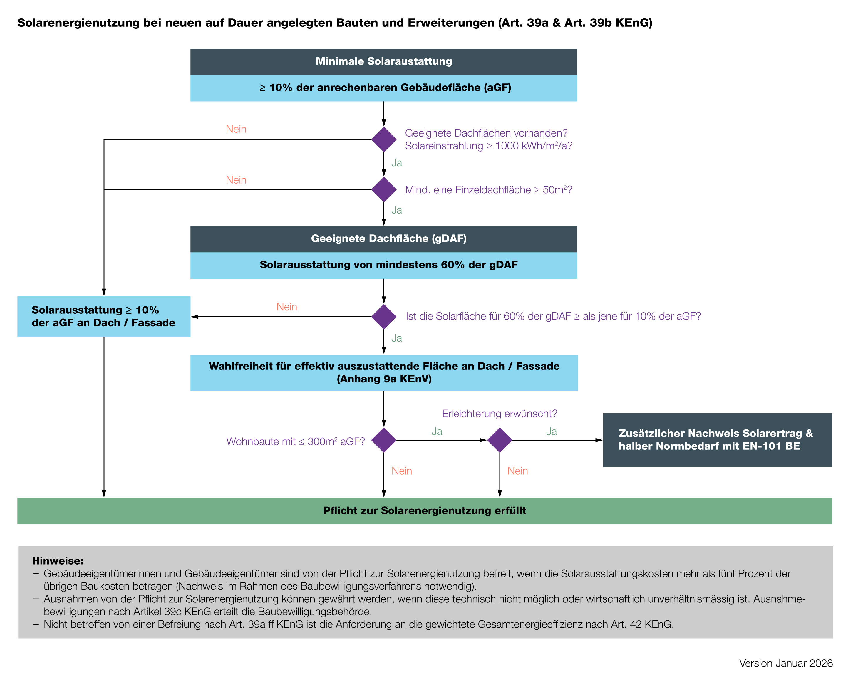 Die gut geeigneten Dachflächen (ab 1000 kWh/m2a) müssen möglichst vollständig genutzt werden, das heisst mindestens 60 Prozent der Brutto-Dachfläche. Dachflächen von weniger als 50 Quadratmetern sind von dieser Pflicht ausgenommen.