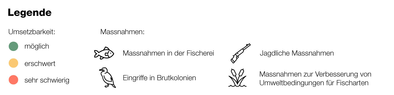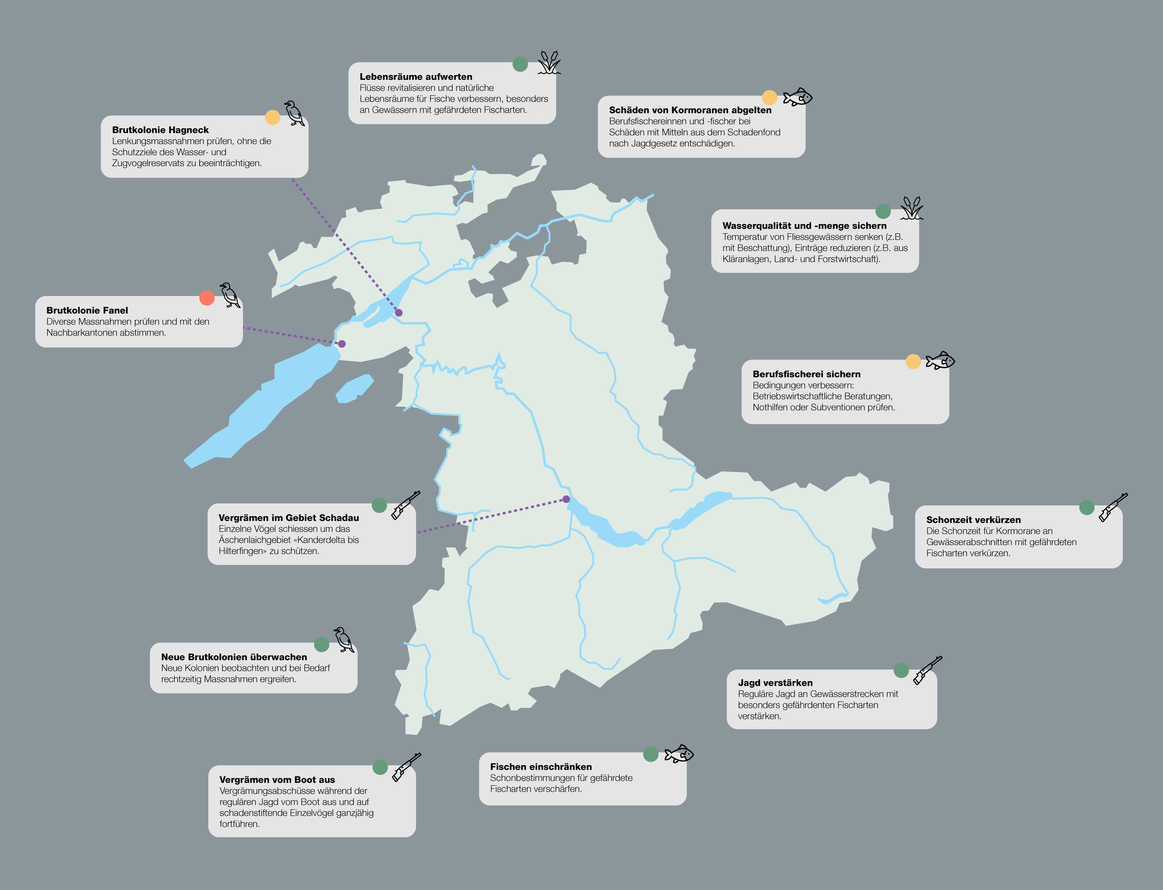 Gestützt auf diesen Auftrag haben die kantonalen Fachstellen neue Lösungen für den Umgang mit dem Kormoran erarbeitet. Einerseits soll der Bestand auf einem Niveau stabilisiert werden, das eine nachhaltige Fischerei ermöglicht. Andererseits werden Massnahmen ergriffen, um bedrohte Fischarten und ihre Laichgebiete zu schützen und die Lebensräume aufzuwerten.
