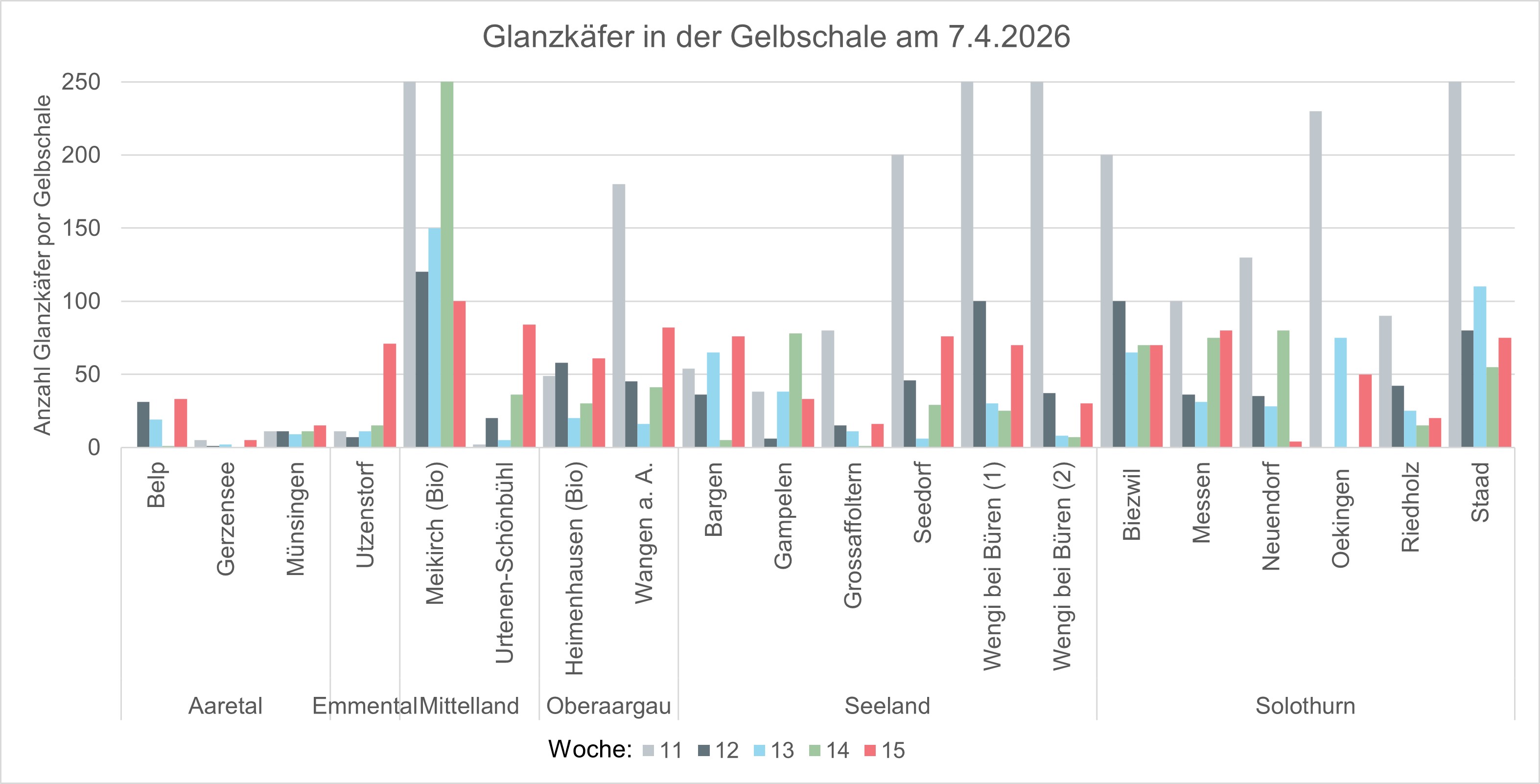 - Die wärmeren Temperaturen seit letztem Donnerstag und über das Osterwochenende haben auch die Aktivität des Glanzkäfers wieder etwas gefördert, wie die Gelbschalenfänge zeigen (siehe Grafik).