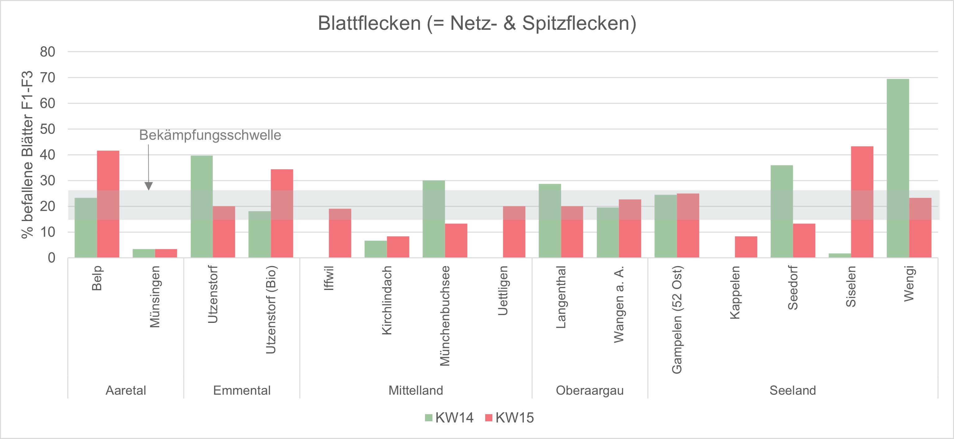 - Auch diese Woche wurde die Bekämpfungsschwelle für Blattflecken an 10 von 15 Standorten erreicht (siehe Grafik). Mehltau wurde keiner und Zwergrost nur selten gefunden.