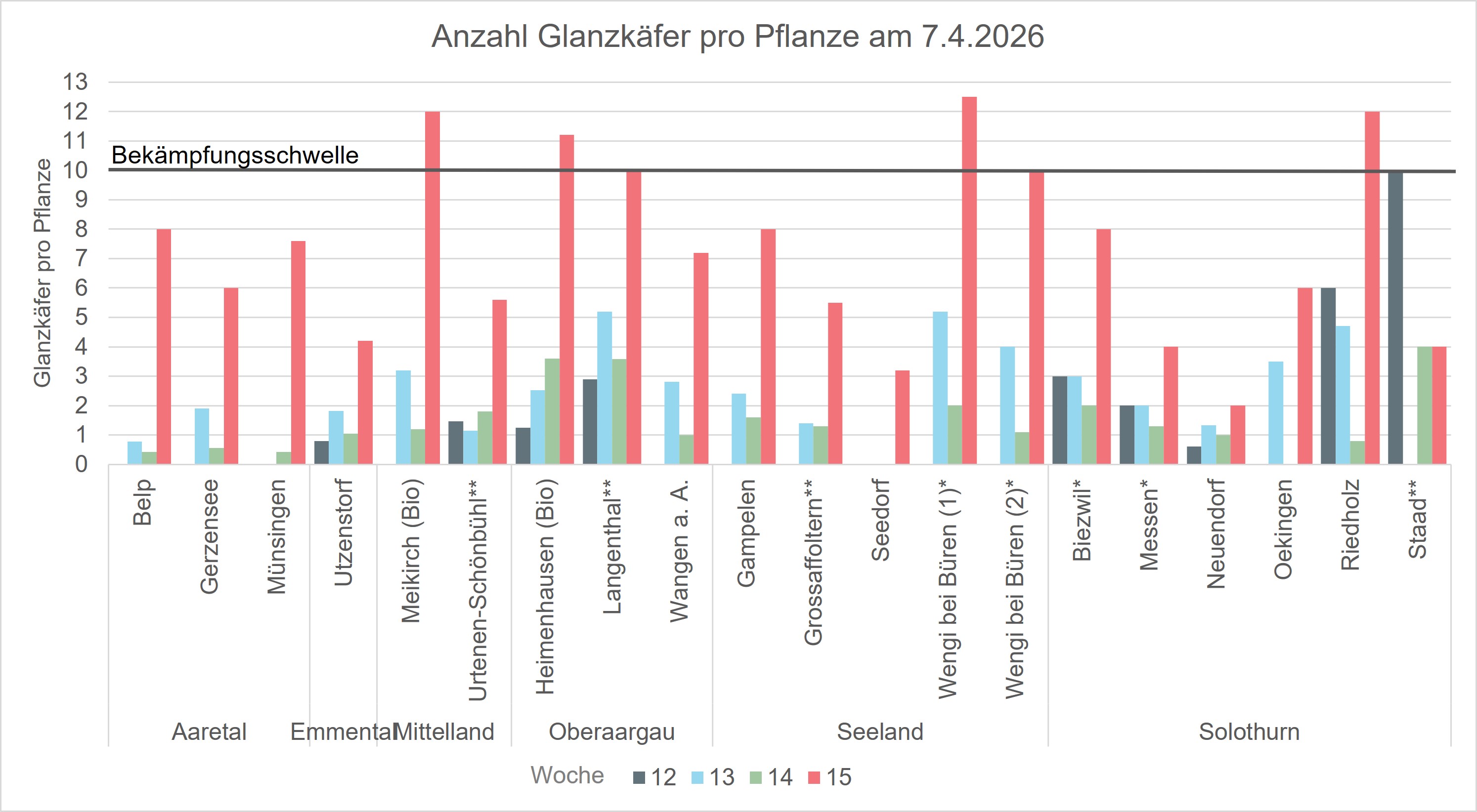 Es wurden 5x10 Pflanzen pro Standort kontrolliert und die Anzahl Glanzkäfer pro Pflanze ausgerechnet. Am Osterwochenende wurde die Bekämpfungsschwelle vereinzelt (wieder) erreicht. * = einmal behandelt, ** = zweimal behandelt.