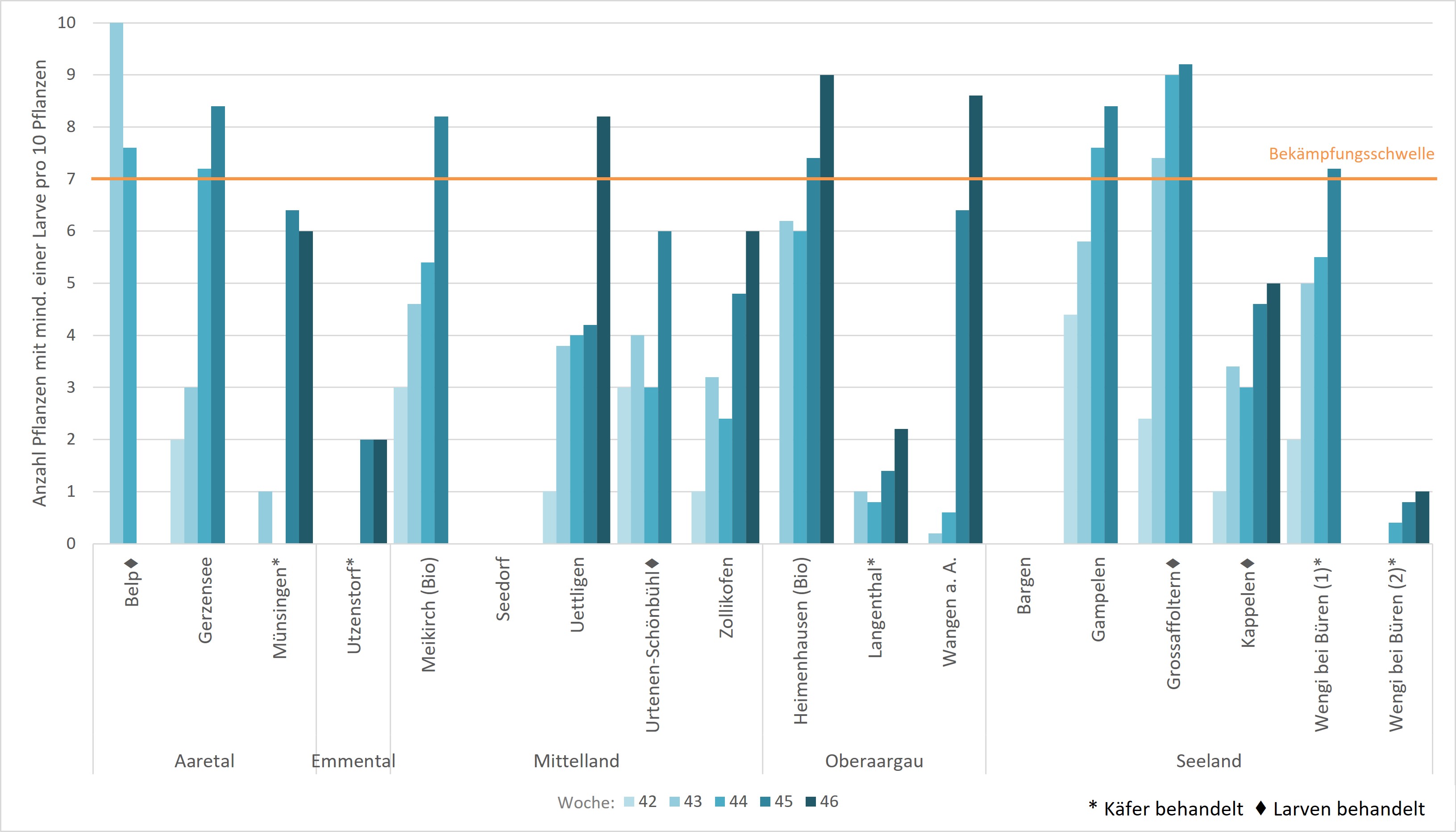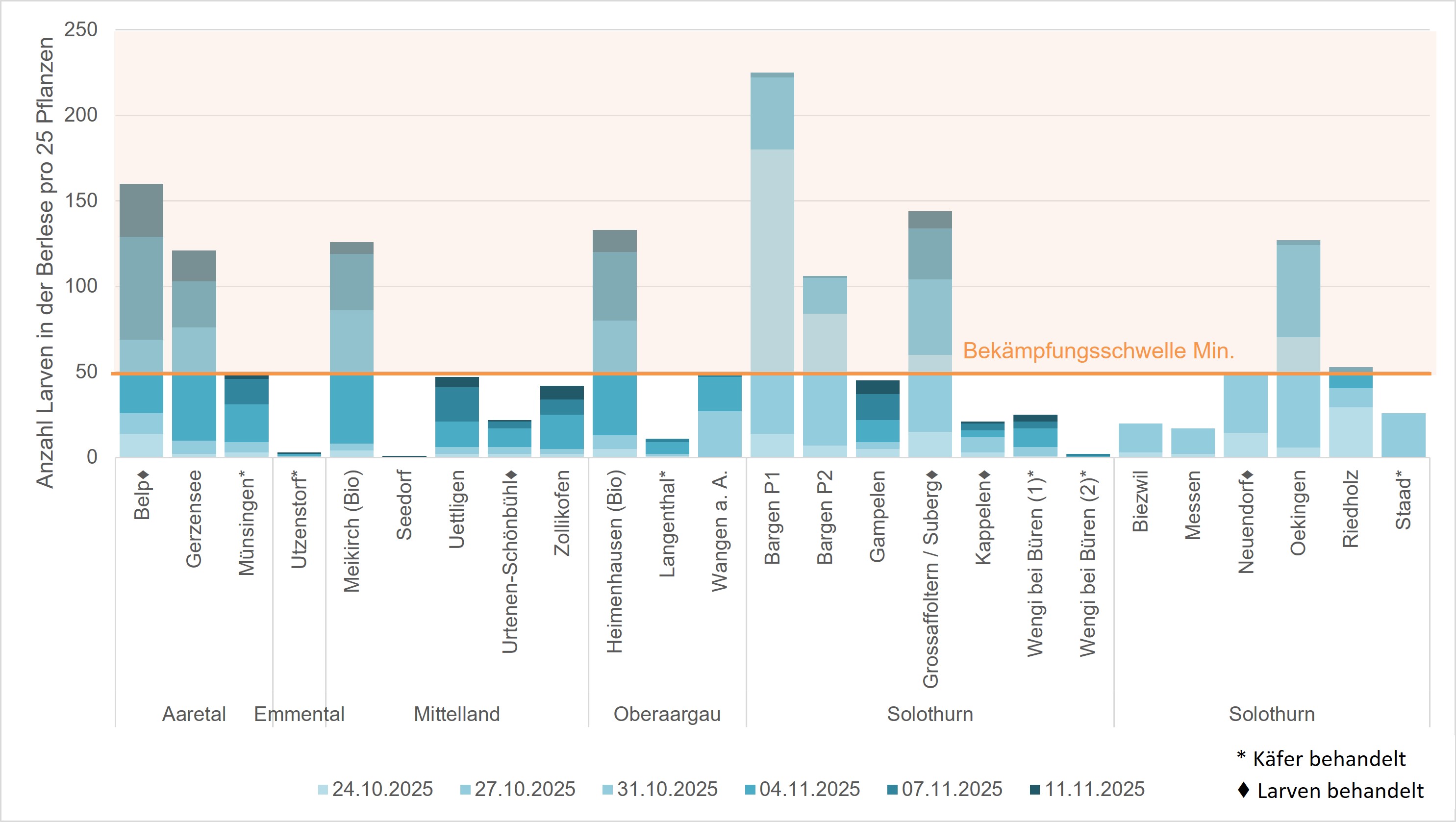 - Ist die Bekämpfungsschwelle erreicht, kann bei der Fachstelle Pflanzenschutz eine Sonderbewilligung beantragt werden (nur Pyrethroide zugelassen). Bitte unter "Bemerkungen" reinschreiben, wie viele Larven ausgezählt wurden.