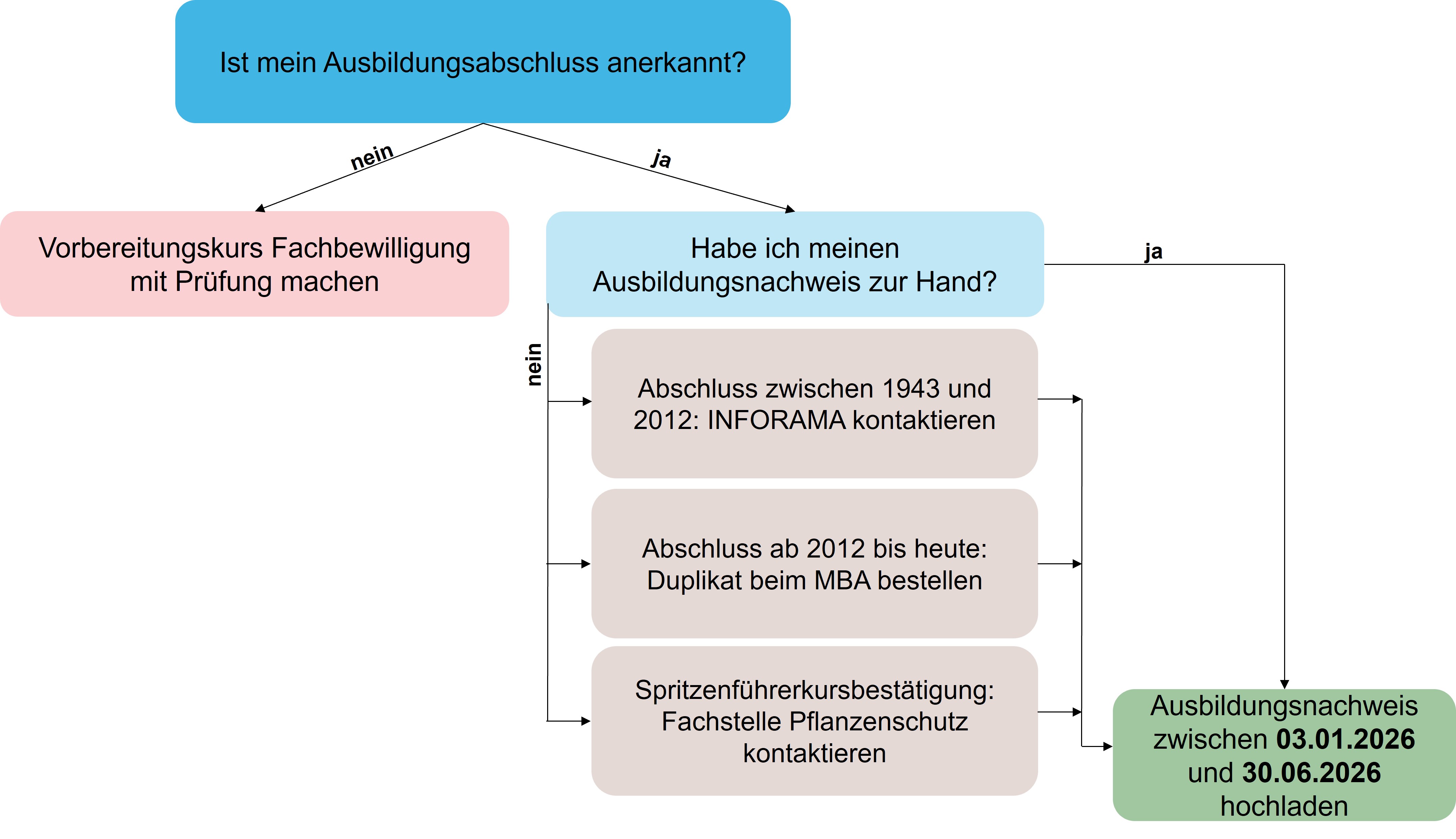- Nein → Fachbewilligungs-Prüfung mit Vorbereitungskurs (bei Bedarf) machen (Kurse | INFORAMA)