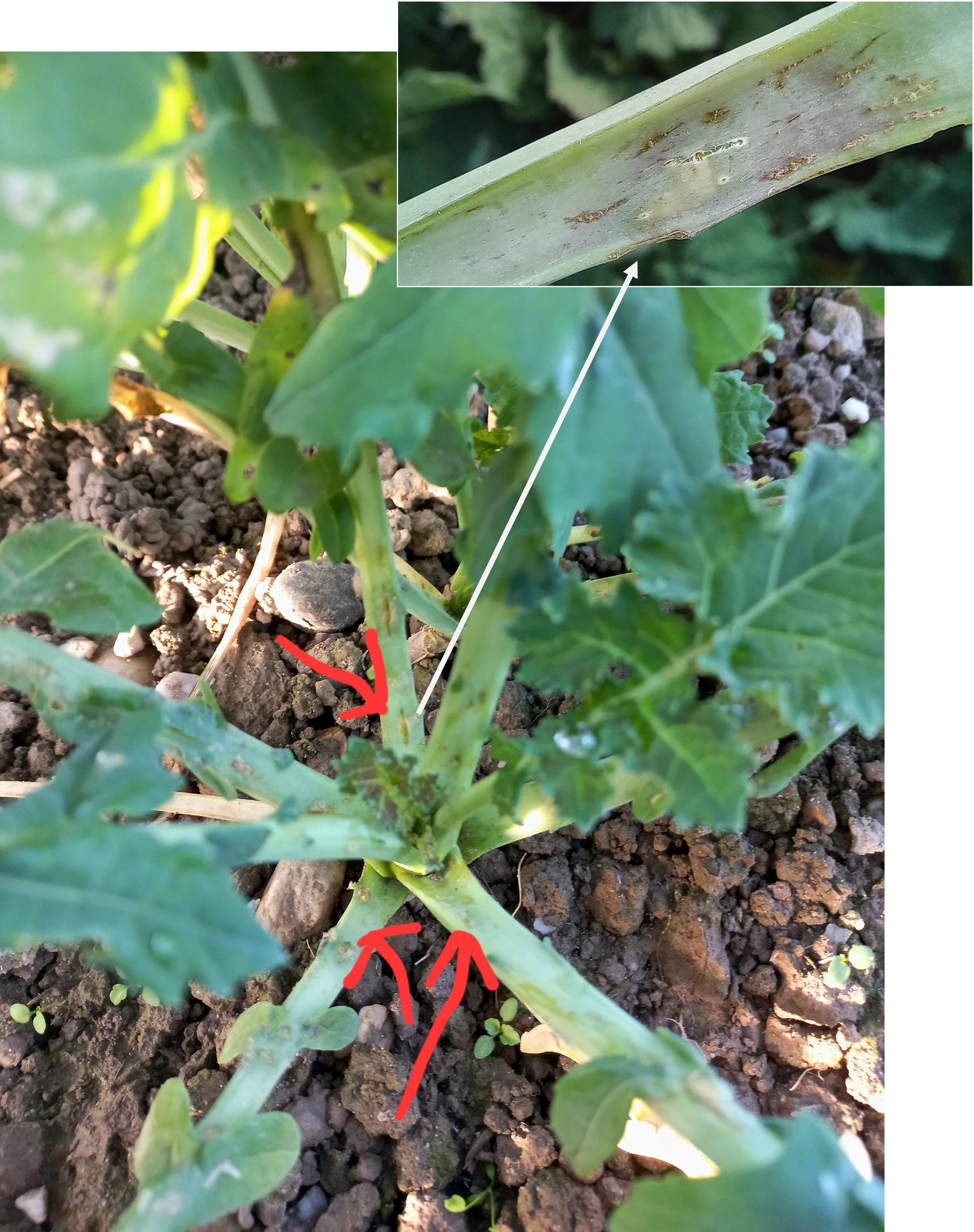 - Die Larvengänge findet und sieht man an den Blattstielansätzen, wenn man von oben auf die Pflanzen schaut. Die Gänge sind leicht aufgehellt, teilweise sieht man auch aufgeplatztes oder vernarbtes Gewebe. Zur Bestimmung werden die Rapsstiele am besten aufgeschnitten oder bei der verdächtigen Stelle gebrochen. Sind unter der Eintrittsstelle Frassgänge oder eine Larve sichtbar, handelt es sich höchst wahrscheinlich um den Rapserdfloh. Am besten werden stichprobenartig 50 Pflanzen (an 10 Orten im Feld jeweils 5 Pflanzen) untersucht. Die Larven haben eine schwarze Kopfkapsel und sind mit 2-5 mm Länge noch klein.