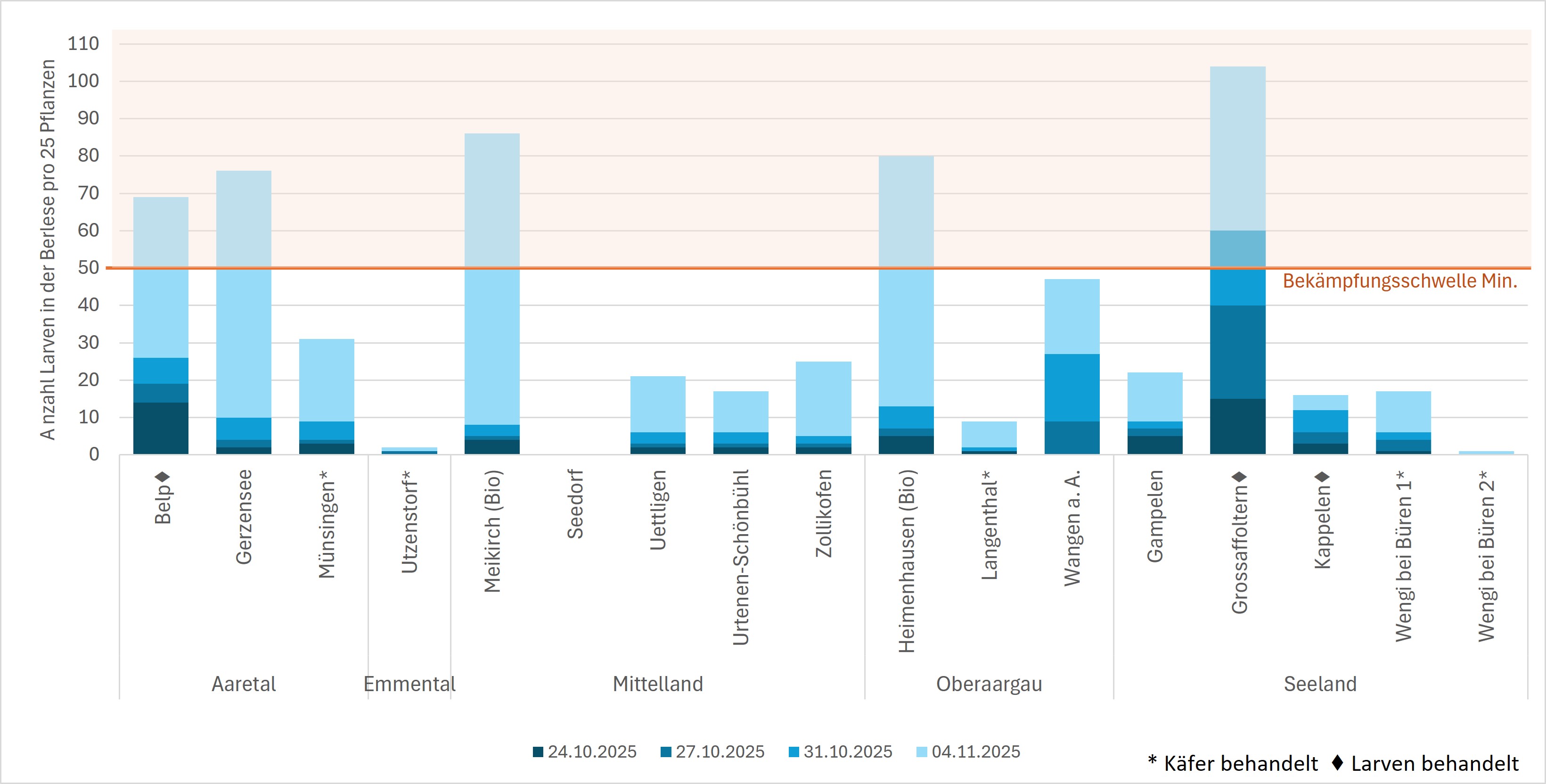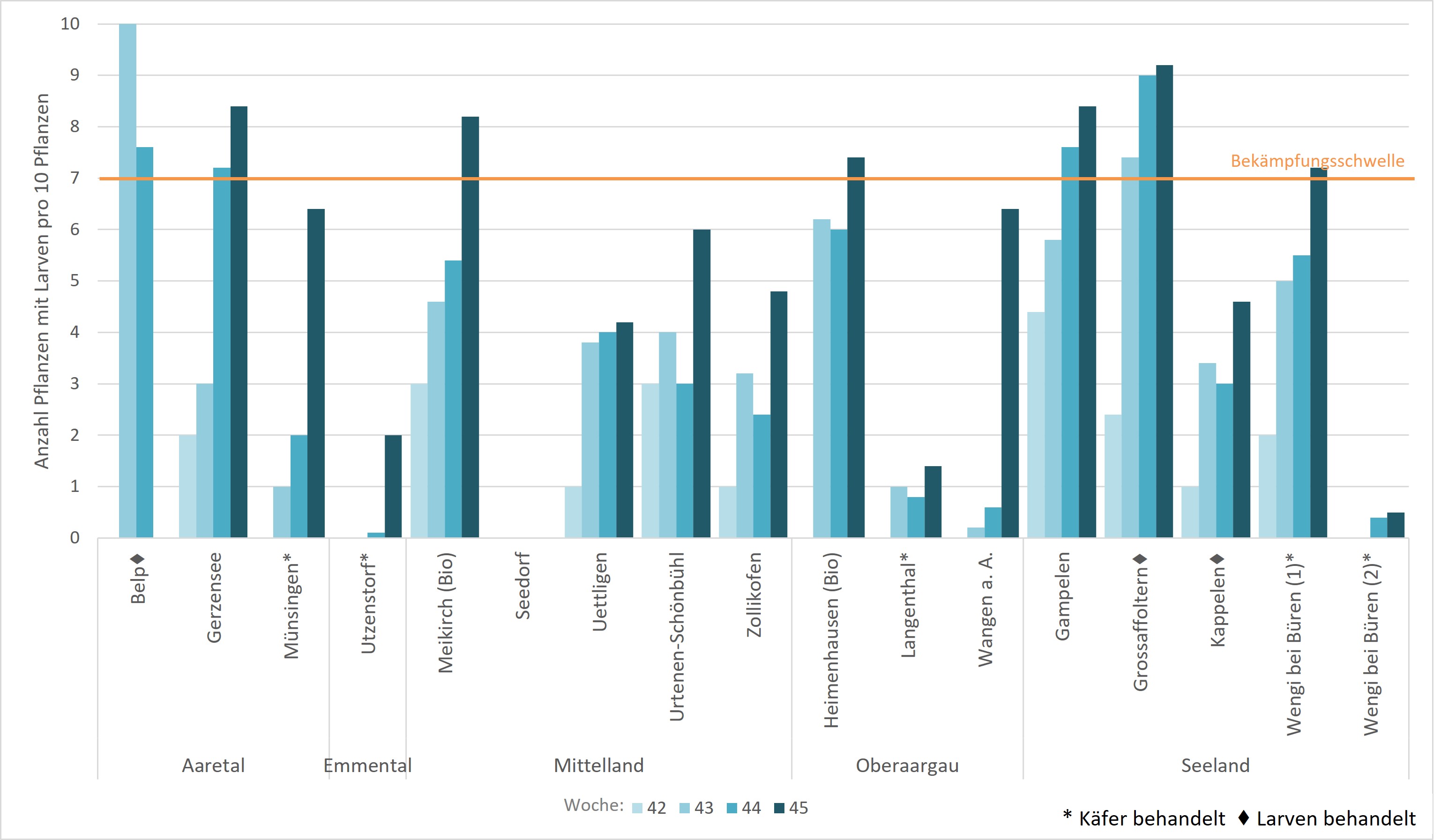 - Bisher wurde im Beobachtungsnetz die Bekämpfungsschwelle für die Larven an total 7 von 17 Standorten erreicht. An 3 von 17 Standorten wurde die Bekämpfungsschwelle nur knapp erreicht. An 5 Standorten wurde der Käfer bereits im Keimblattstadium des Raps behandelt. Die beiden Bio-Parzellen können natürlich trotz Erreichen der Bekämpfungsschwelle nicht behandelt werden.
