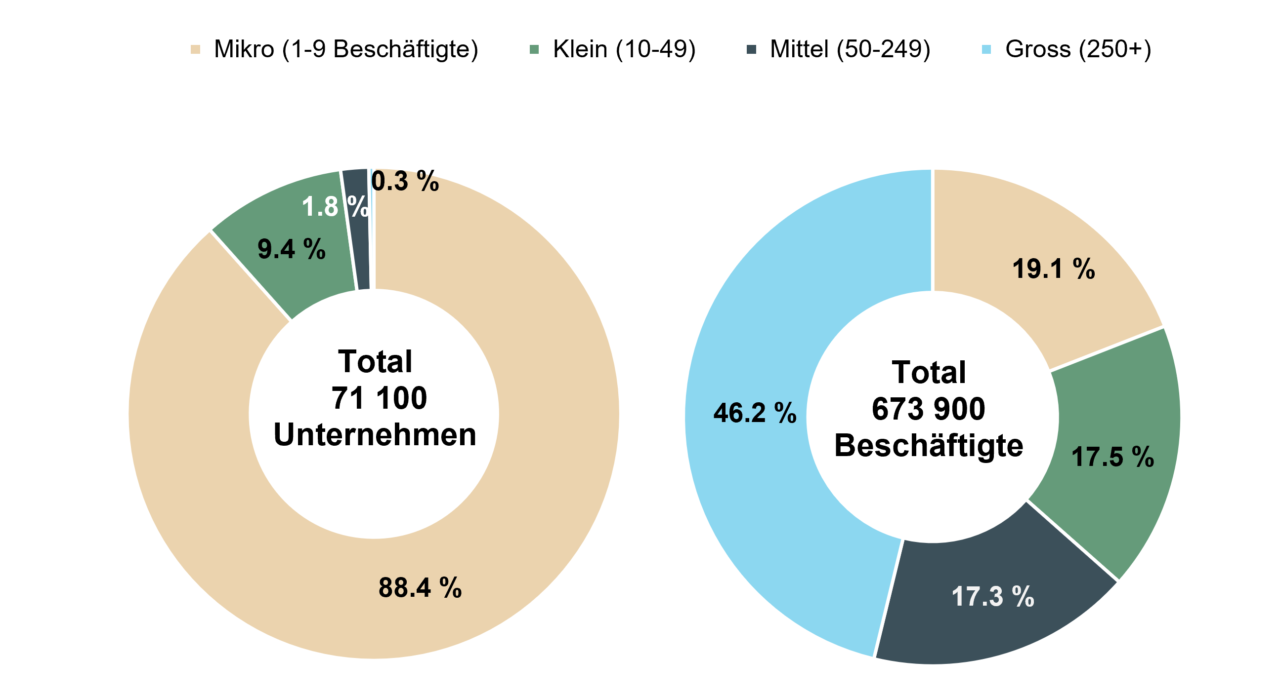 250 Beschäftigten. Bei den Beschäftigten zeigt sich ein ausgewogeneres Bild: 54 Prozent arbeiten in einem KMU, 46 Prozent in einem Grossunternehmen (inkl. der öffentlichen Verwaltung und staatsnahen Unternehmen).