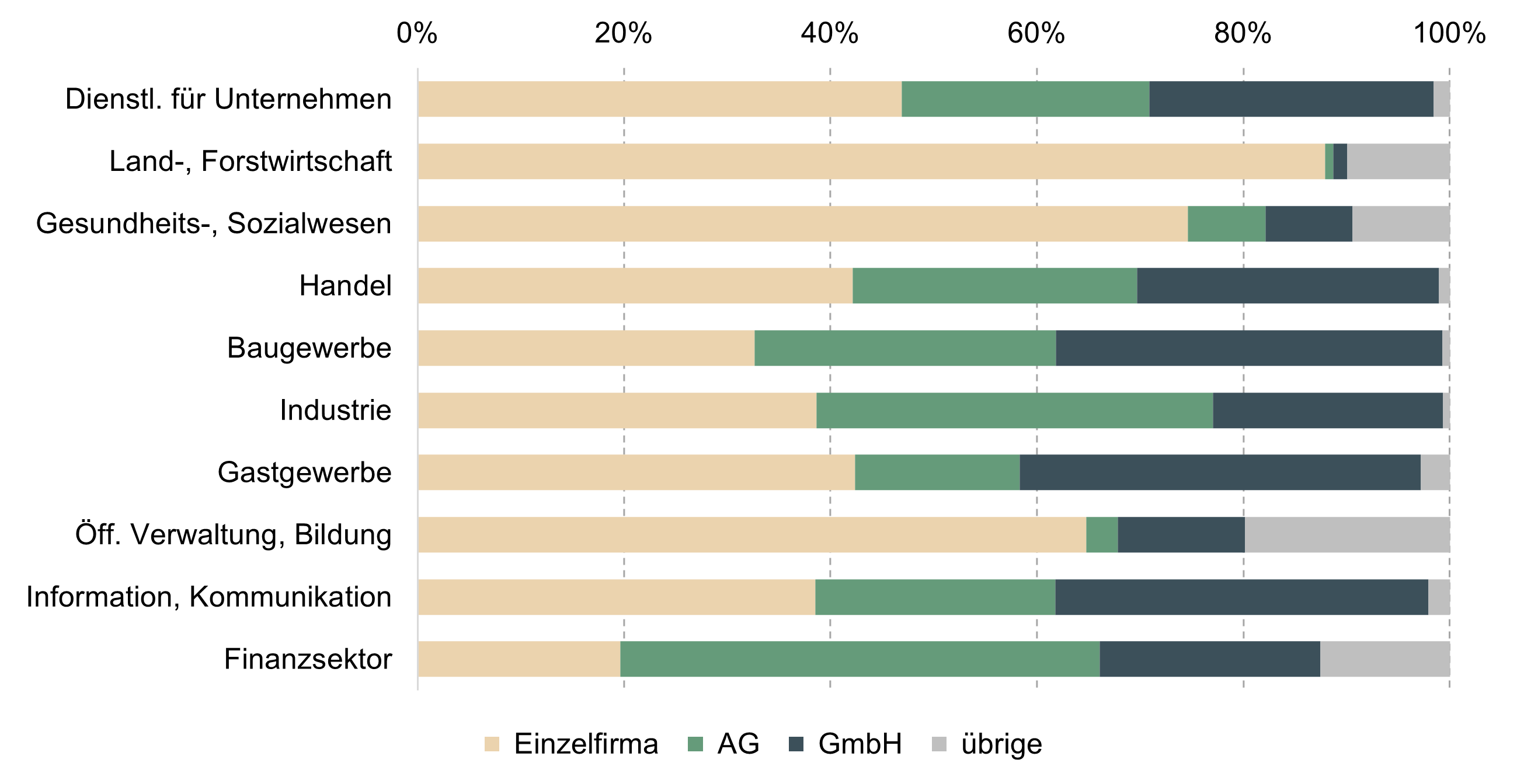 Die Einzelfirma stellt mit einem Anteil von 56 Prozent die mit Abstand häuftigste Rechtsform dar. Mit Anteilen von jeweils nahezu 20 Prozent stellen die Gesellschaft mit beschränkter Haftung (GmbH) und die Aktiengesellschaft (AG) weitere zentrale Rechtsformen dar. Vor allem im Finanzsektor, in der Informations- und Kommunikationsbranche, in der Industrie sowie im Baugewerbe – wo es jeweils auch überdurchschnittlich viele grössere Unternehmen hat – werden diese beiden kapitalbezogenen Rechtsformen überdurchschnittlich oft gewählt.