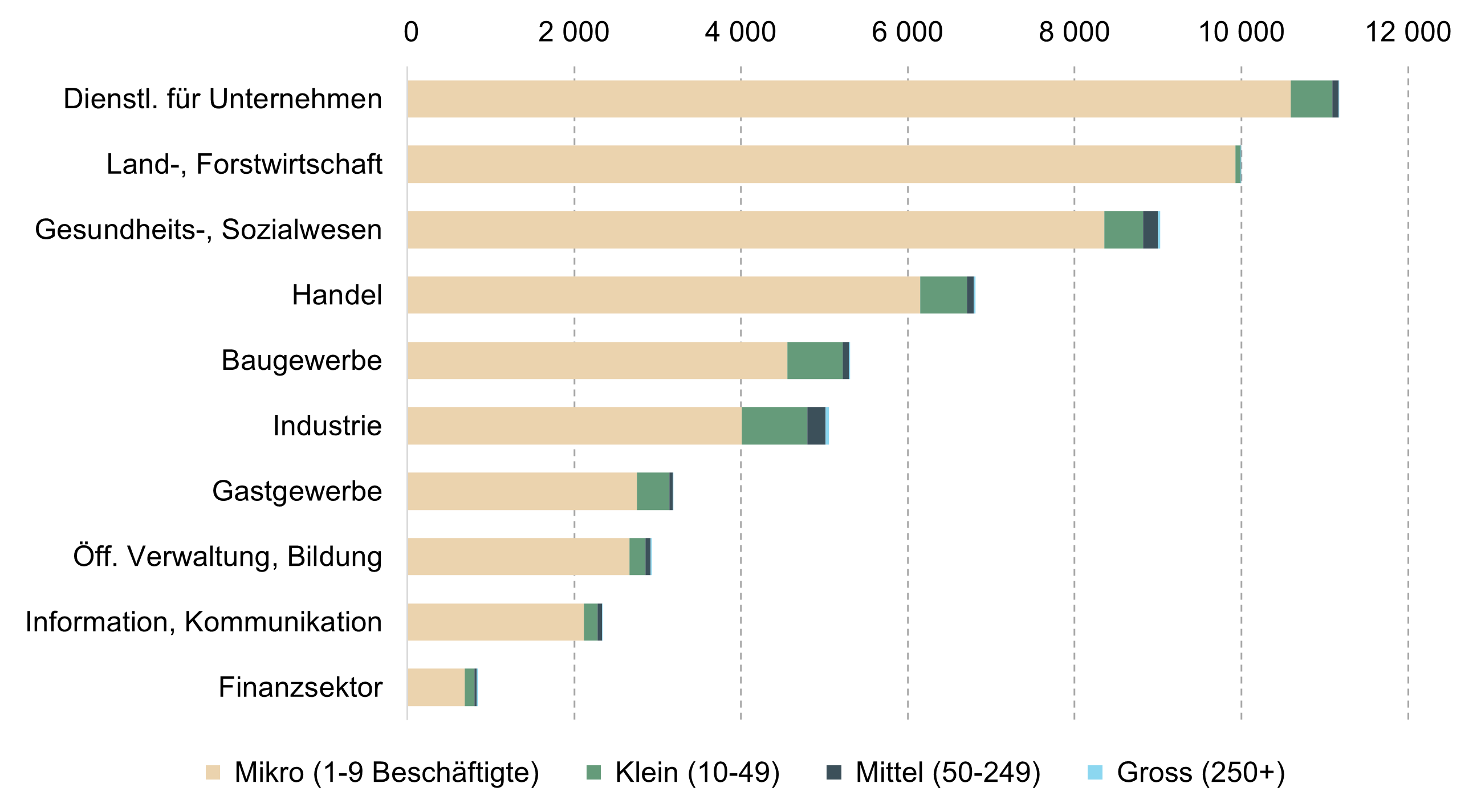 Mikrounternehmen stellen in allen Branchen die mit Abstand häufigste Unternehmensform dar, ihr Anteil beträgt jeweils mindestens 80 Prozent. Besonders in der Land- und Forstwirtschaft sind fast ausschliesslich Mikrounternehmen tätig. In der Industrie und im Finanzsektor ist der Anteil an grösseren Unternehmen überdurchschnittlich hoch.