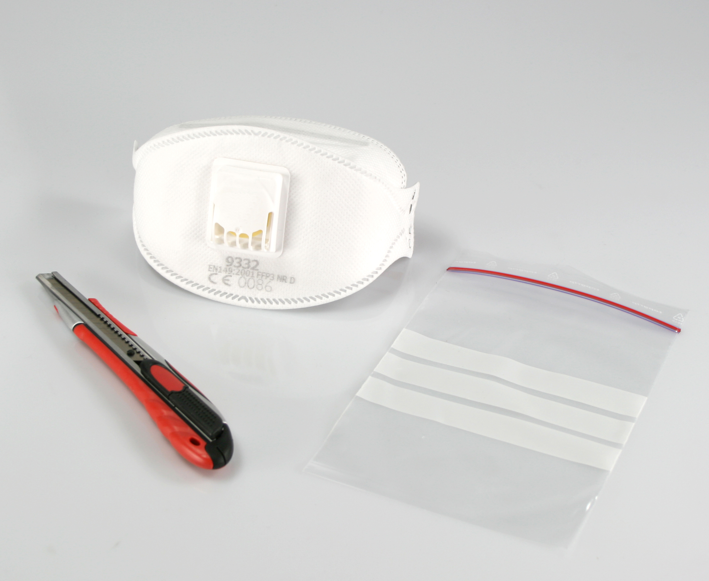 Asbest ist ein Gefahrstoff. Bei der Probenahme ist Vorsicht geboten: FFP3-Feinstaubmaske, Schutzbrille und Handschuhe sind nötig. Die Probe muss alle Schichten des verdächtigen Materials enthalten und ca. 5-Fränkler bis handflächengross sein. Bild: SUVA.