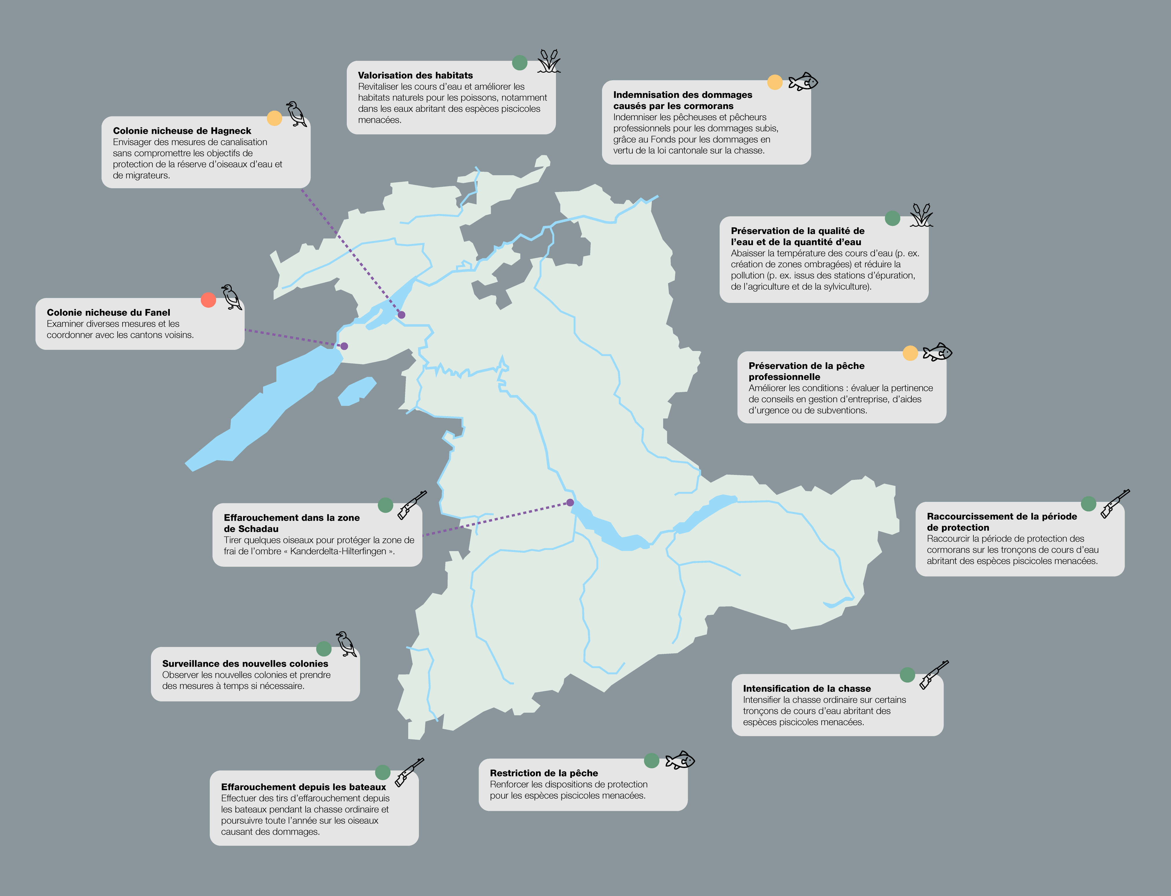 Sur la base de ce mandat, les services spécialisés cantonaux ont élaboré de nouvelles solutions pour la gestion du cormoran. D’une part, la population doit être stabilisée à un niveau qui permette une pêche durable. D’autre part, des mesures sont prises pour protéger les espèces piscicoles menacées ainsi que leurs zones de frai, et pour valoriser les habitats.